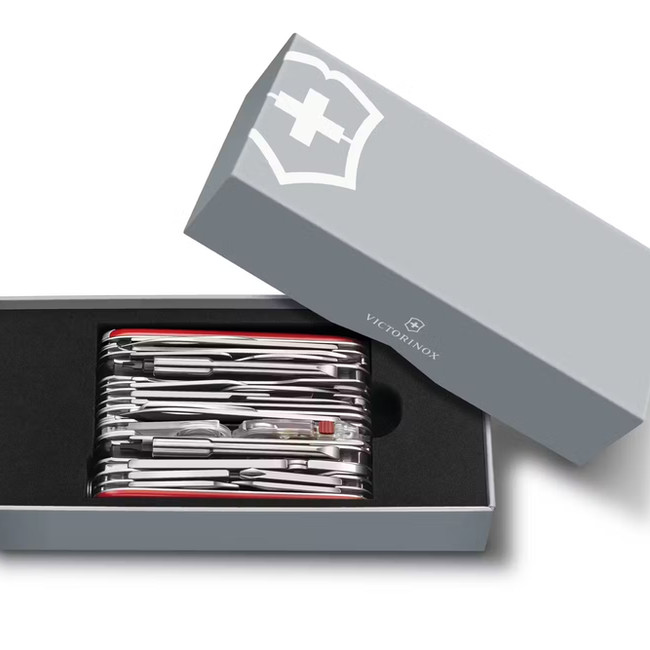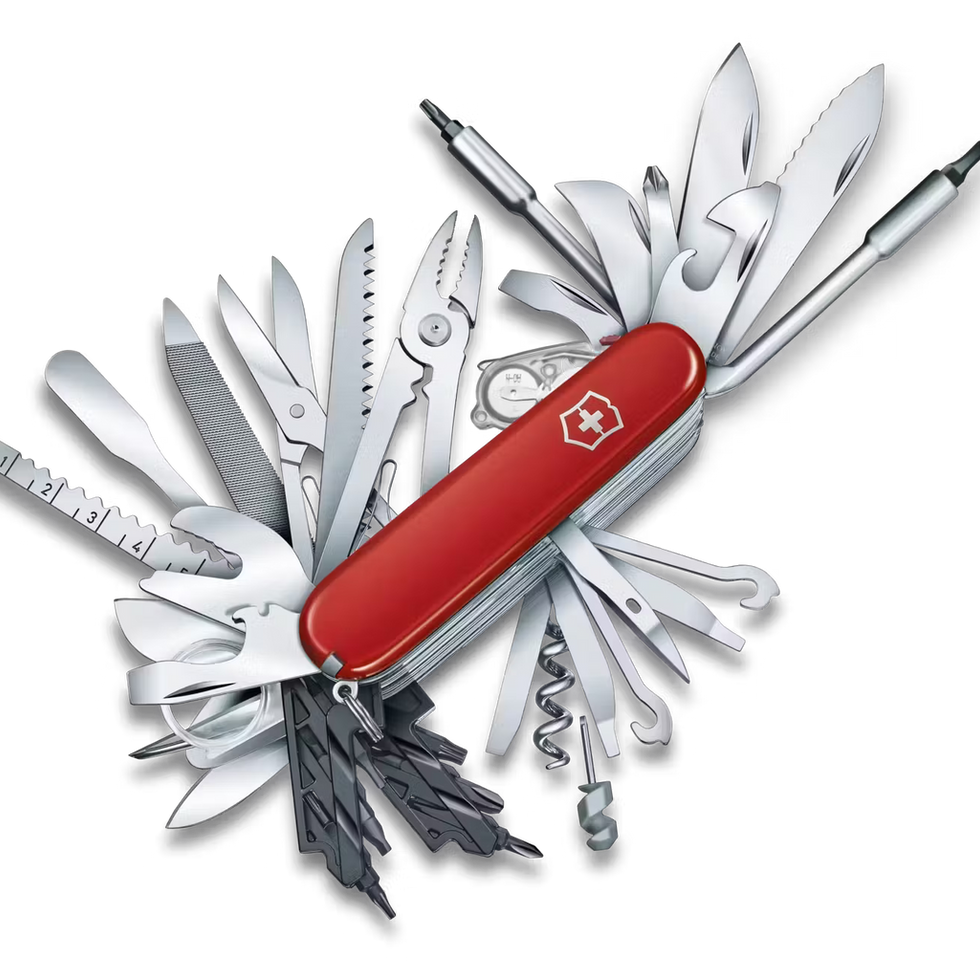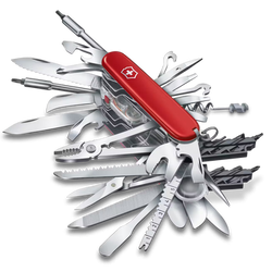 Súper práctica y única en su clase: te presentamos la Swiss Champ XXL, una poderosa navaja de bolsillo. Armada con 73 funciones, esta navaja puede enfrentarlo todo. Cada pieza está ensamblada a mano de manera meticulosa por artesanos habilidosos para garantizar óptima calidad. Es una compañera reafirmantemente sólida y a la vez sorprendentemente portátil para desafíos al aire libre desde descamar pescados hasta serruchar metal, así como también tareas rápidas de interior como simplemente limar sus uñas.